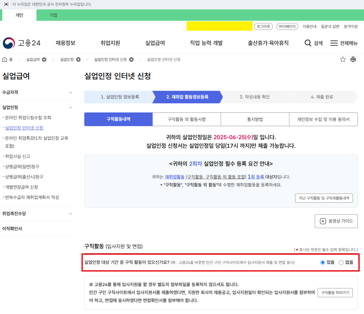 1. 구직활동내역 입력 화면에서 "실업인정 대상 기간중 구직 활동이 있으신가요?"항목을 '있음'체크한다.
