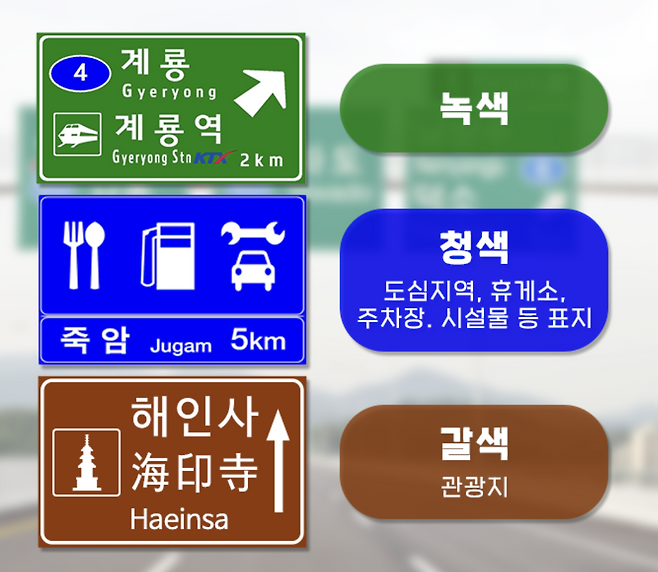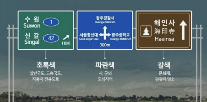- 초록색 표지판: 도시 간 장거리 안내