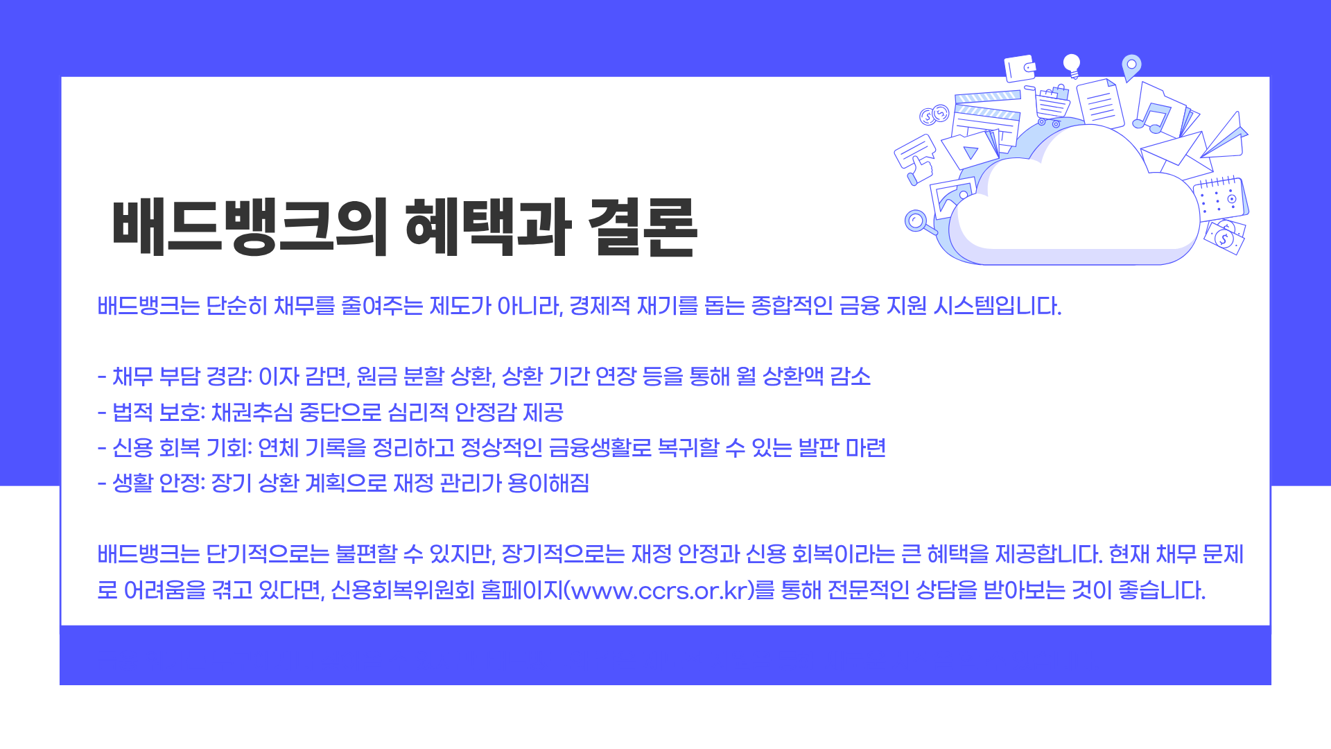 배드뱅크 신청을 통해 얻을 수 있는 혜택은 단순히 채무 조정에 그치지 않습니다: