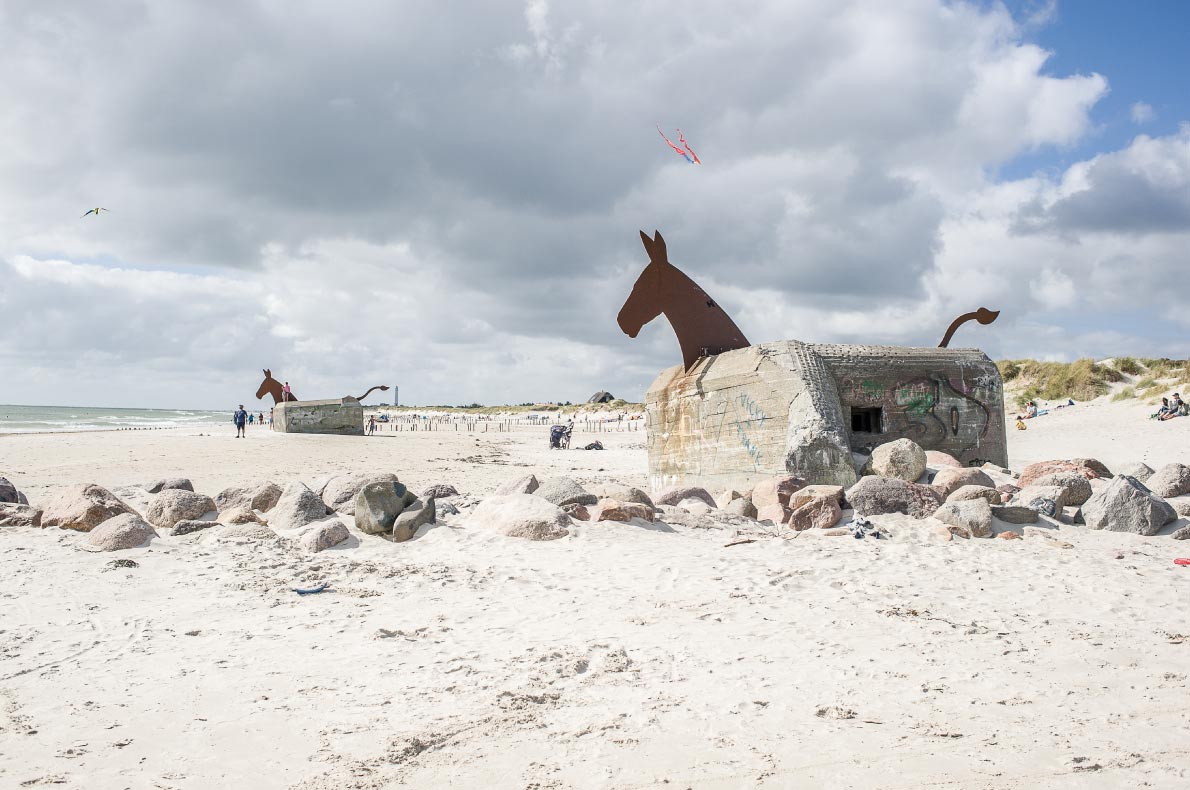 이곳의 해변에는 2차 세계대전 당시 건설된 벙커가 예술적으로 변형되었는데, 이 경우 평화의 상징인 말로 변형되었습니다.